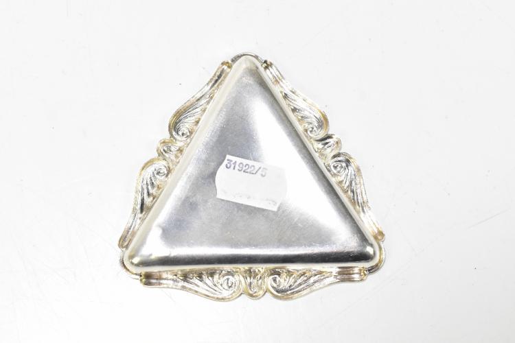 Lot 1651 of 1719: JEWELLERY & METAL MANUFACTURING CO; an Irish hallmarked silver triangular pin dish with scrolled detail to rim, Dublin 1979, 9.2 x 9.5cm, approx 1.3ozt/42.8g.