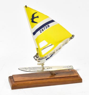 Lot 1653 of 1719: A 925 silver model yacht with plastic sail inscribed ‘Sacchetti’ and bearing no. 26739 on rectangular wooden base, with London import mark, height 8.4cm.