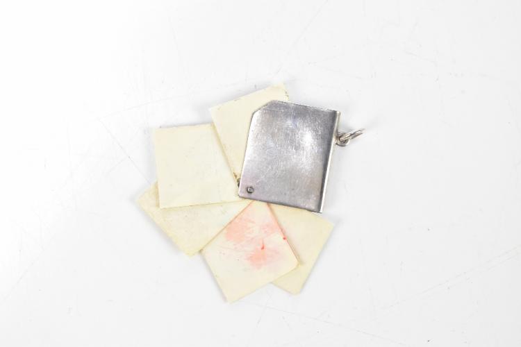 Lot 1656 of 1719: WILLIAM J HOLMES; a George V hallmarked silver trumps/bridge marker with full set of five cards, four bearing the suits and one inscribed ‘No Trumps’, Chester 1929, 2.4 x 2cm, with loop attachment.