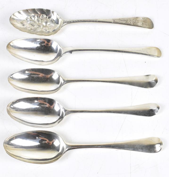 Lot 1812 of 1719: ISAAC CALLARD; an 18th century silver tablespoon engraved with a crown and the letter C to the terminal, 20cm, a further 18th century pressed shell back spoon with engraved initials SEI to the terminal, a double drop back 18th century spoon with engraved initials A.B., a further 18th century spoon with engraved crest to the terminal and an 18th century spoon later converted to a berry spoon, all hallmarks are obscured, approx 9.4ozt/292.3g.