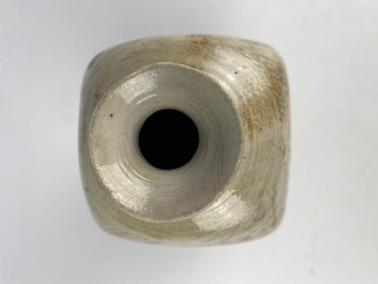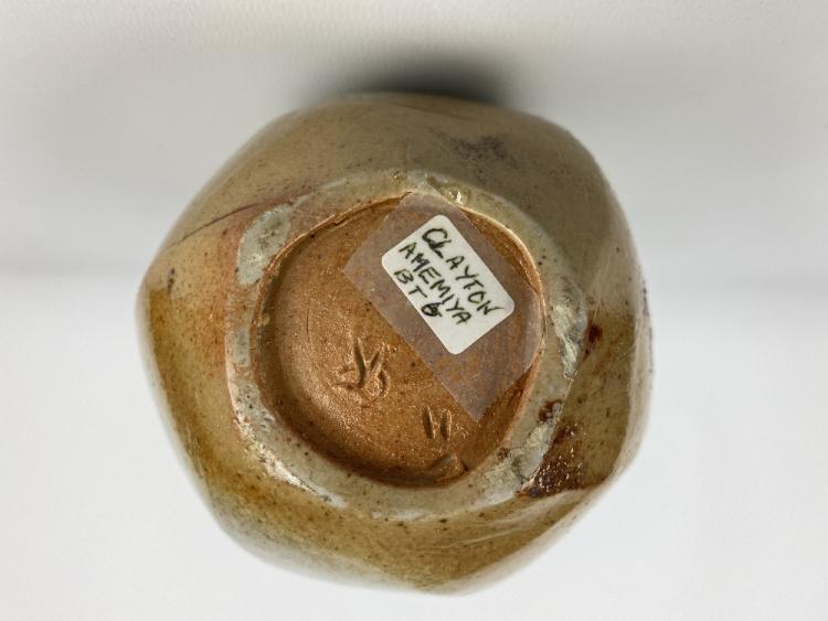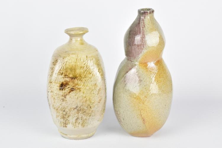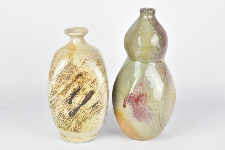 Lot 8 of 1051: CLAYTON AMEMIYA; a gourd shaped faceted wood fired stoneware bottle and a square bottle, incised CA marks, tallest 23cm (2). Provenance: Purchased in Hawaii, 2014.