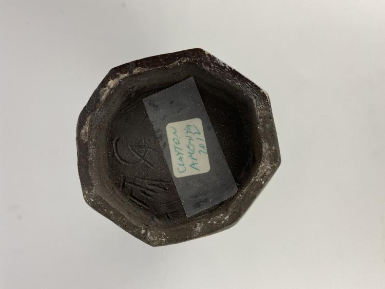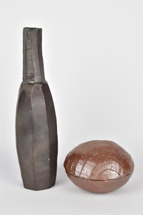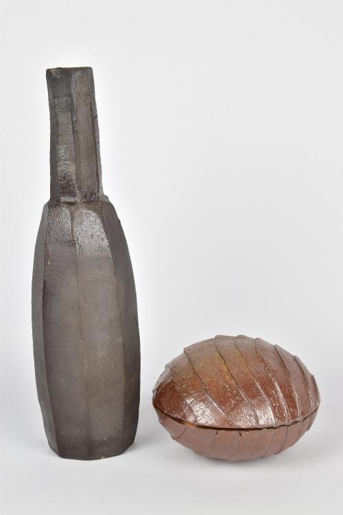 Lot 10 of 1051: CLAYTON AMEMIYA; a cut sided wood fired stoneware bottle and a faceted box and cover, incised CA marks, tallest 29.5cm (2). Provenance: Purchased in Hawaii, 2014.
