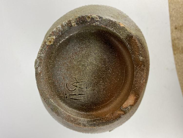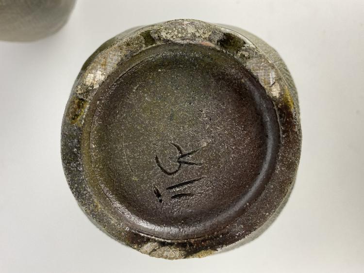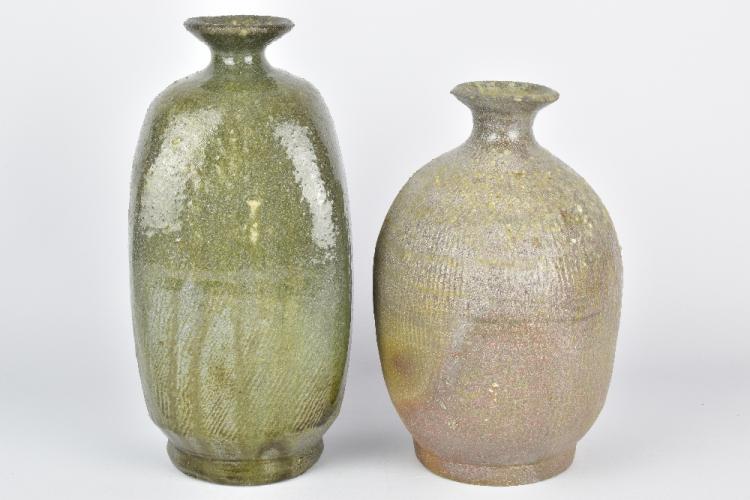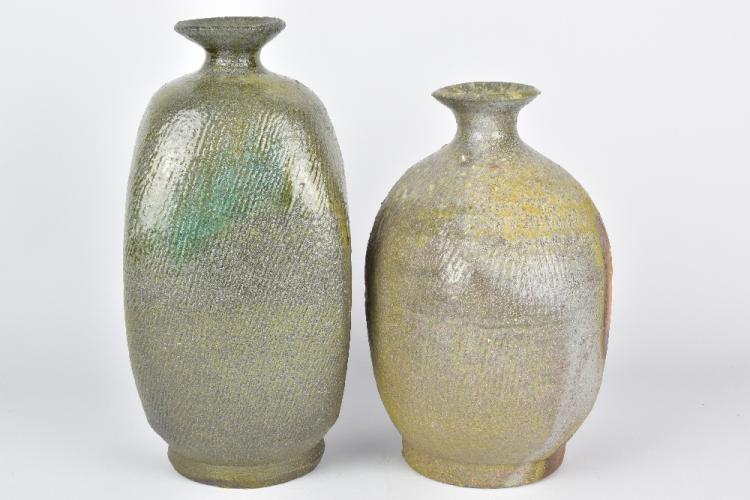 Lot 17 of 1051: CLAYTON AMEMIYA; a square wood fired stoneware bottle and an oval bottle, incised CA marks, tallest 24cm (2). Provenance: Purchased in Hawaii, 2015.