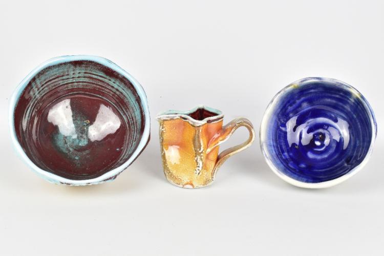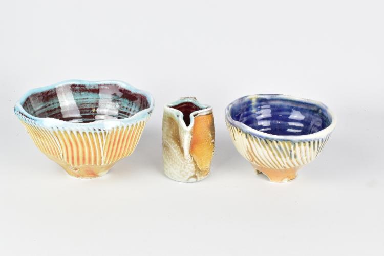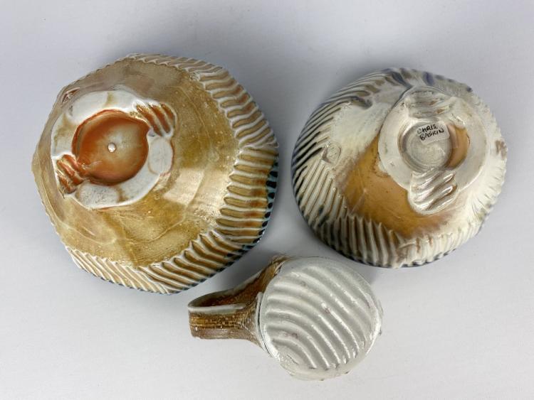 Lot 30 of 1051: CHRIS BASKIN; two cut sided fluted soda fired porcelain bowls and a small jug, impressed CB marks, largest diameter 16.5cm, jug height 8.5cm (3).  Baskin is based in Portland, Oregon. Provenance: Purchased in 2017.