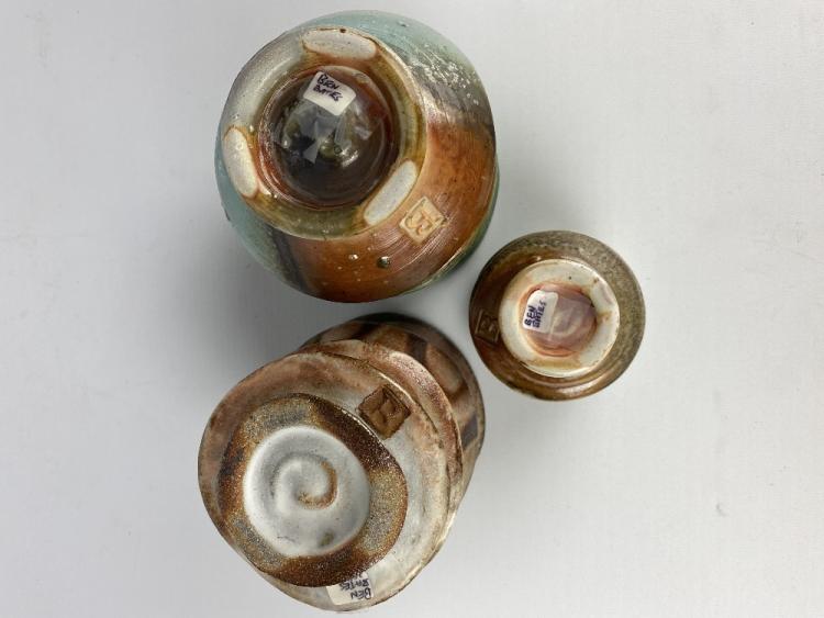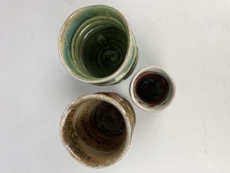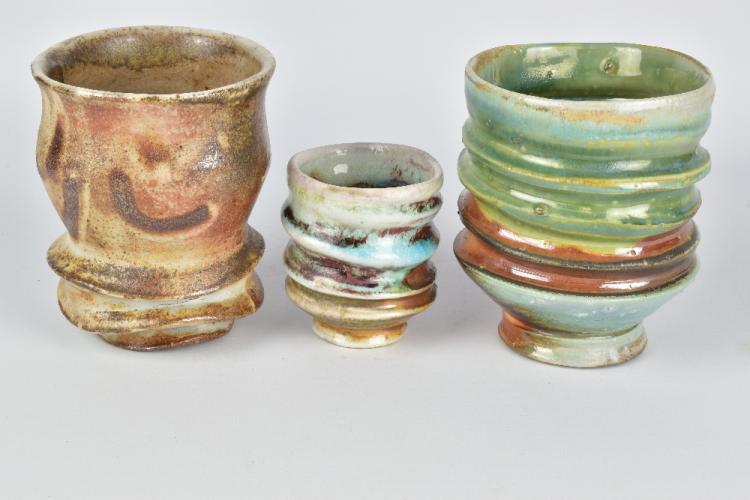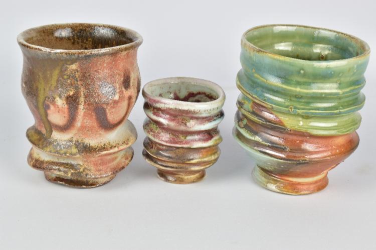 Lot 34 of 1051: BEN BATES; a ribbed wood fired porcelain beaker, a stoneware beaker and a small porcelain beaker, impressed B marks, tallest 12cm (3). Provenance: Purchased from Schaller Gallery, St Joseph, Michigan 2017.