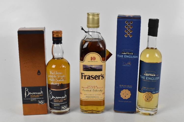 Lot 6 of 1934: WHISKY; four 70cl bottles of Single Malt Scotch Whisky comprising two Laphroaig '10 Years Old, Glenfiddich '12 Years Old' and an Islay 'Aged 10 Years' for Morrisons, a 50cl bottle of Fraser's '10 Years Old', and 20cl of Benromach and The English Original, six in original presentation cartons (7).