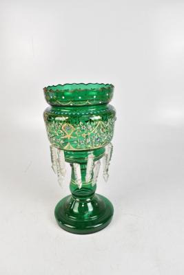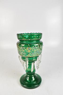 Lot 1169 of 1934: A 19th century green glass table lustre with gilt and enamelled floral decoration suspending clear prism drops, height 36cm.