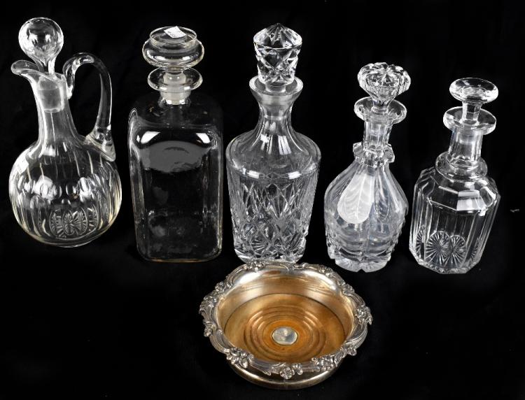Lot 1171 of 1934: Five 19th century and later glass decanters and claret jug, also a silver mounted bottle stand (6).