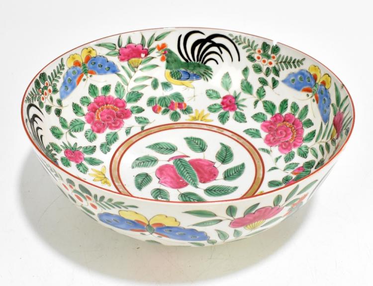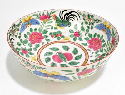 Lot 1248 of 1934: A late 19th/early 20th century Chinese Famille Rose porcelain footed bowl, painted with cockerels, butterflies and floral sprays, diameter 28cm, with stylised Qianlong mark to base (af).