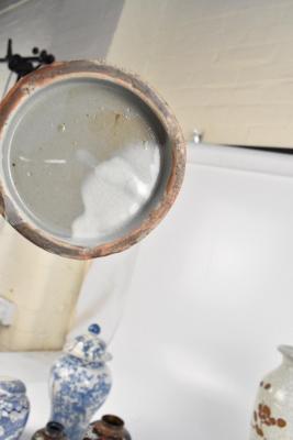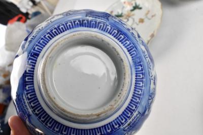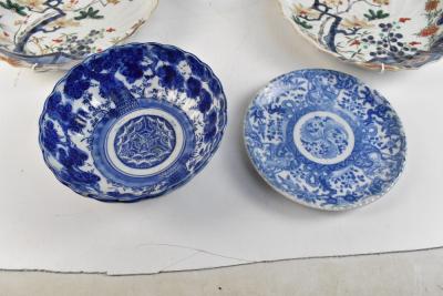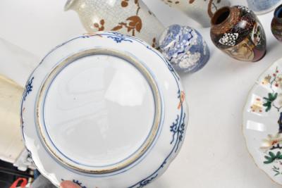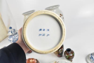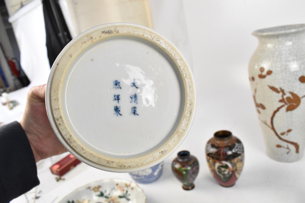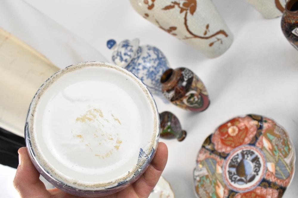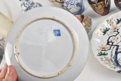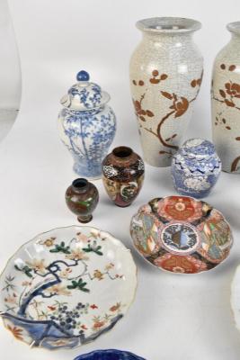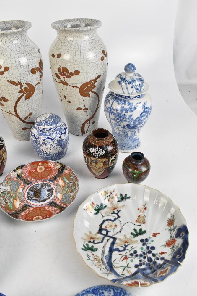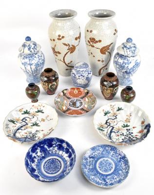 Lot 1259 of 1934: A group of Chinese and Japanese ceramics including a large pair of Ge-type crackle glazed vases with floral decoration, unmarked, height 37.5cm, two 20th century lidded jars with underglaze blue decoration and apocryphal Kangxi marks to bases (both lids af), two pairs of Chinese cloisonne  enamelled vases with panelled decoration, a pair of shaped dishes decorated in underglaze blue, over glaze gilt and enamels with pine tree, cherry blossom and peonies, both with single ring mark to base, diame