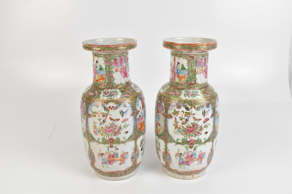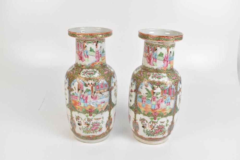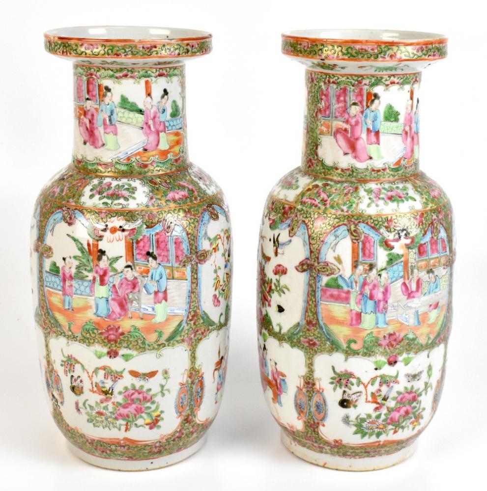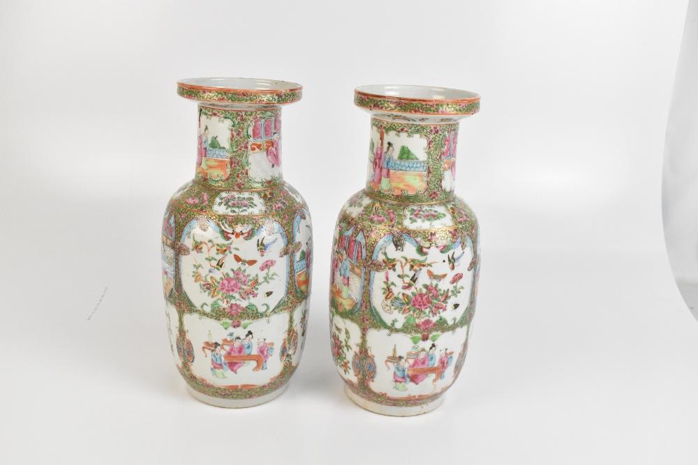 Lot 1260 of 1934: A pair of mid to late 19th century Chinese Canton Famille Rose Rouleau vases with panelled figural and floral decoration and gilt detail, unmarked, height of each 36cm (2).