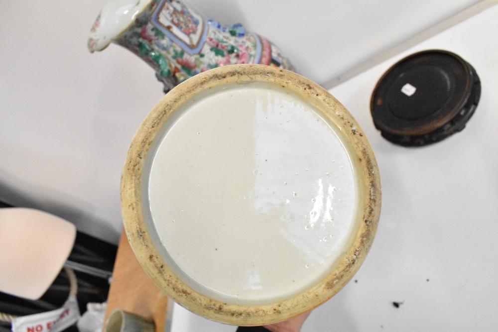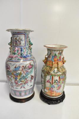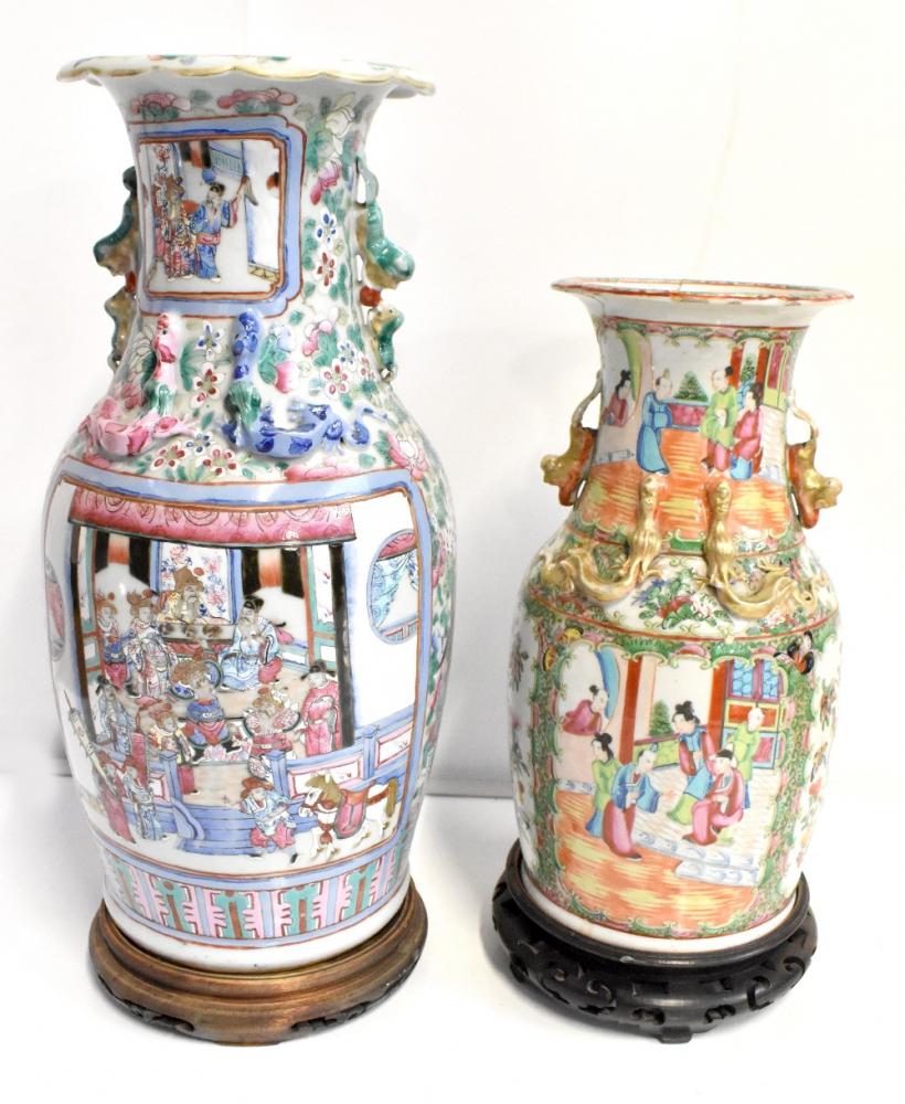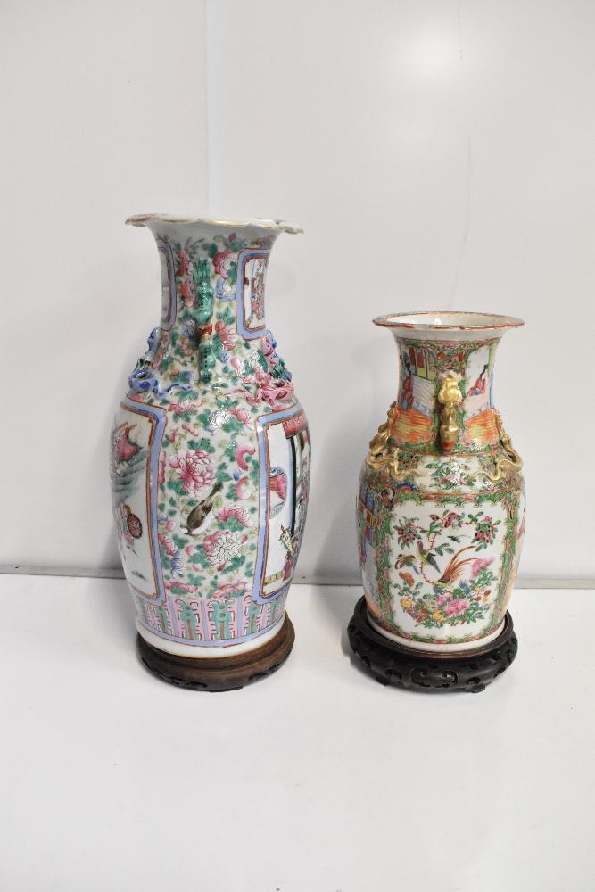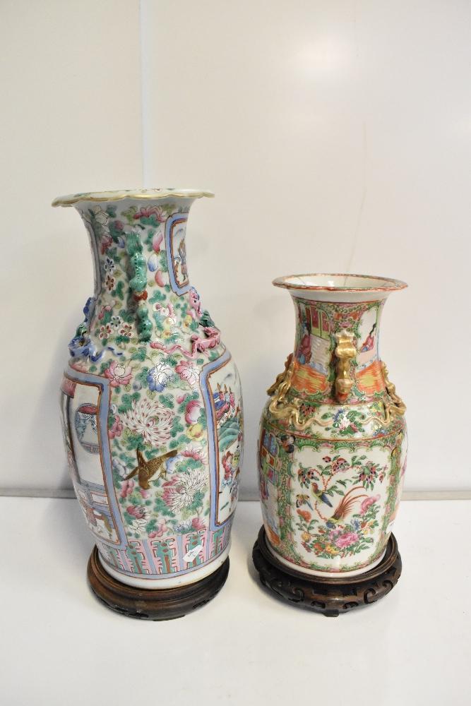 Lot 1263 of 1934: A 19th century Chinese Canton twin handled Famille Rose vase, painted in panels with stylised warriors and figures, inset with floral sprays and auspicious symbols and relief style mythical creatures, height 45cm, and a similar 19th century Canton Famille Rose example, height 35cm.