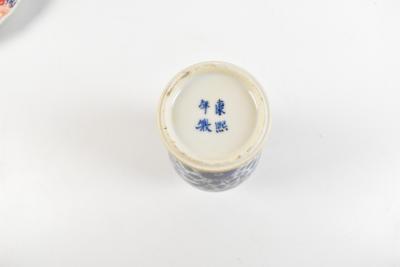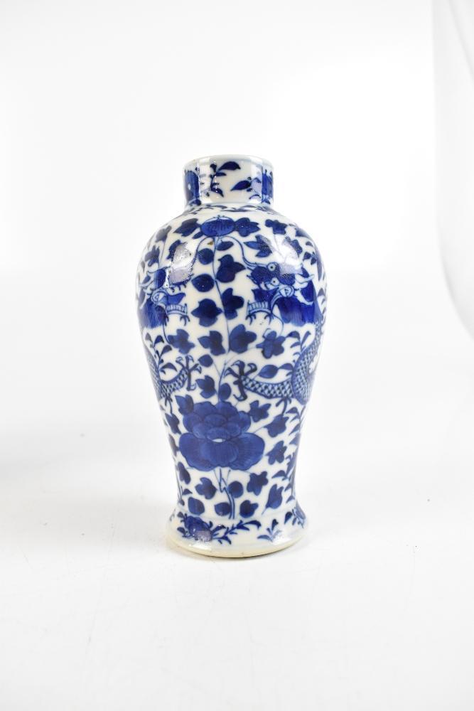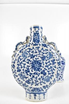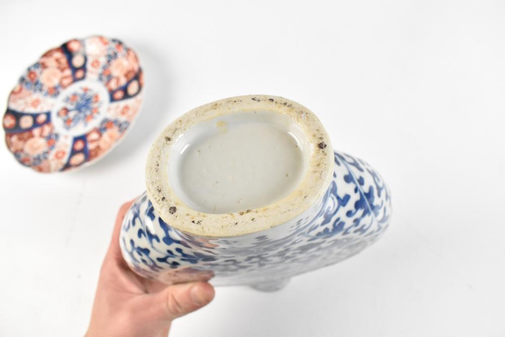 Lot 1265 of 1934: A late 19th century Chinese blue and white porcelain moon flask with hand painted lotus flowers, height 26cm, a Chinese blue and white porcelain vase painted with four claw dragon, bears four character Kangxi to base, height 18cm, and a Chinese Imari dish (3).
