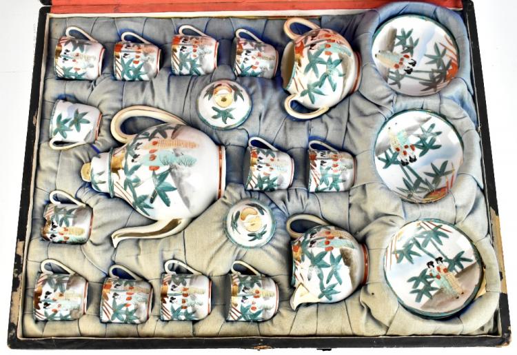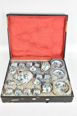 Lot 1266 of 1934: An early 20th century Japanese eggshell porcelain tea service decorated with figures and bamboo trees, in original wooden crate.