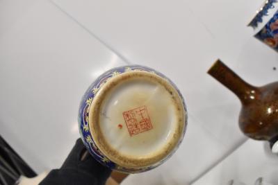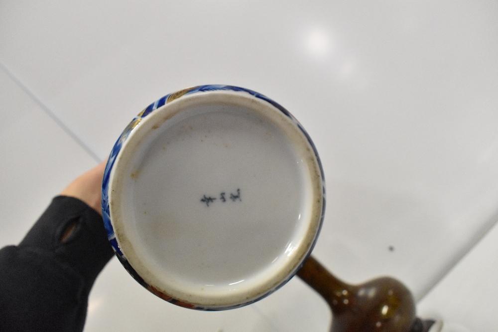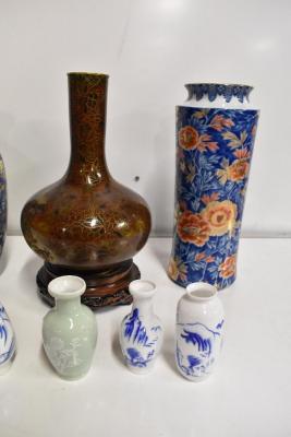 Lot 1267 of 1934: A 20th century Japanese porcelain sleeve vase, with blue floral decoration with gilt highlights, three character signature mark to base, height 30cm, a contemporary cloisonne baluster form vase with floral detail, a celadon ground bud vase, etc (8).