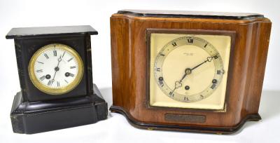 Lot 1302 of 1934: A late 19th century eight day black slate mantel clock, the circular enamelled dial set with Roman numerals and bearing rubbed signature (only 'Brothers' legible), the movement striking on a gong and the back plate stamped 'T.A & B 7104', height 19.5cm (af) and an Elliott Art Deco walnut cased example with dial signed 'Lloyd, Payne & Amiel Ltd Manchester', above plaque inscribed 'Presented to Miss M. Massey by Messrs A.G. Bateman on the occasion of her retirement, December 1951' (2).