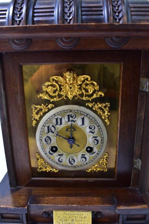 Lot 1305 of 1934: JUNGHANS; a late 19th century carved walnut mantel clock, the brass face with applied gilt detail and silvered circular dial, with applied presentation plaque to rim, with key and pendulum, height 48cm.