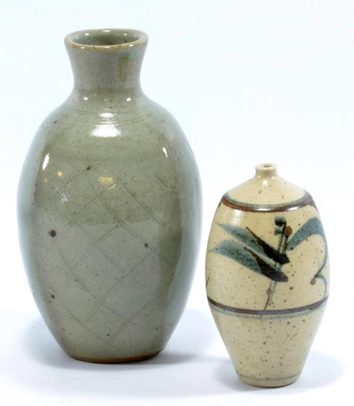 Lot 88 of 668: DEREK CLARKSON (1928-2013); a miniature stoneware vase with narrow neck, iron and cobalt decoration on speckled grey ground, impressed DC mark, height 10.5cm; together with a stoneware vase, impressed SP mark, by another hand (2). (D)