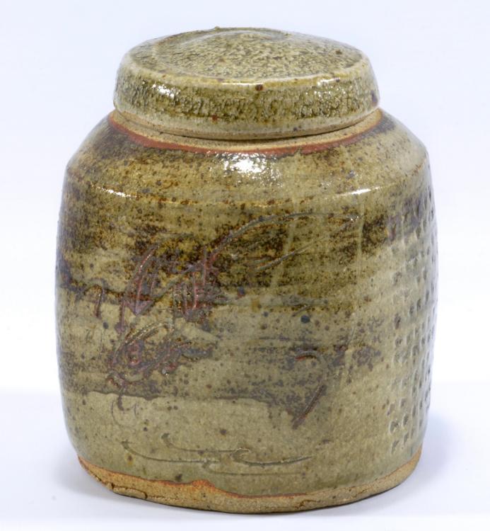 Lot 103 of 668: JIM MALONE (born 1946); a stoneware jar and cover, green ash glaze and incised decoration, impressed JM mark, height 15cm. (D)