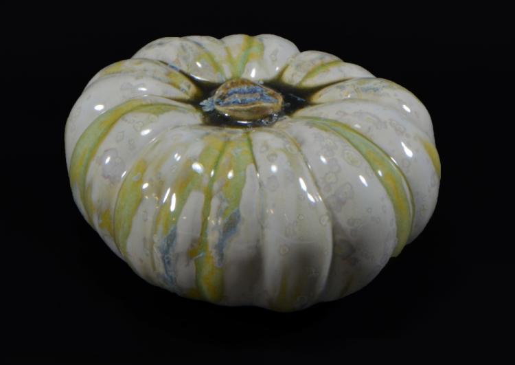 Lot 115 of 668: KATE MALONE; a stoneware pumpkin, yellow and green crystalline glaze, incised signature and date of 2017, diameter 16.5cm. (D)