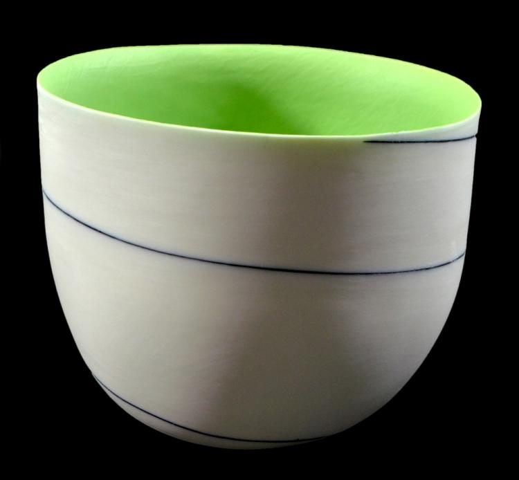 Lot 415 of 668: LARA SCOBIE (born 1967); a porcelain bowl with inlaid decoration, lime green interior, incised signature, maximum diameter 15cm. (D)