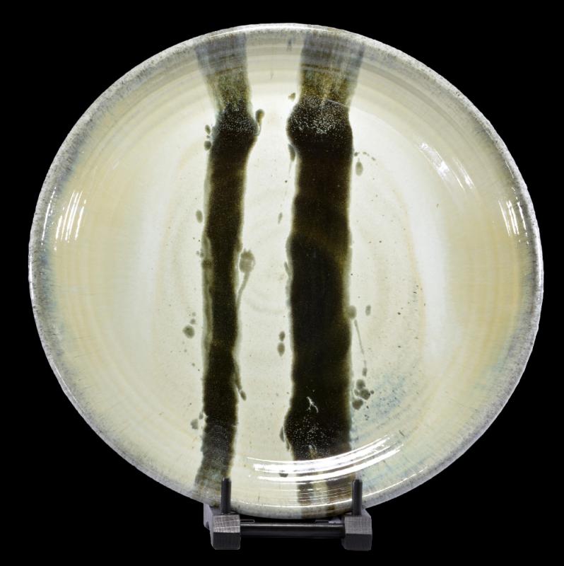 Lot 425 of 668: JAMES HAKE (born 1979); a monumental stoneware charger covered in nuka ash glaze with tenmoku pours, impressed JH mark, diameter 67cm.