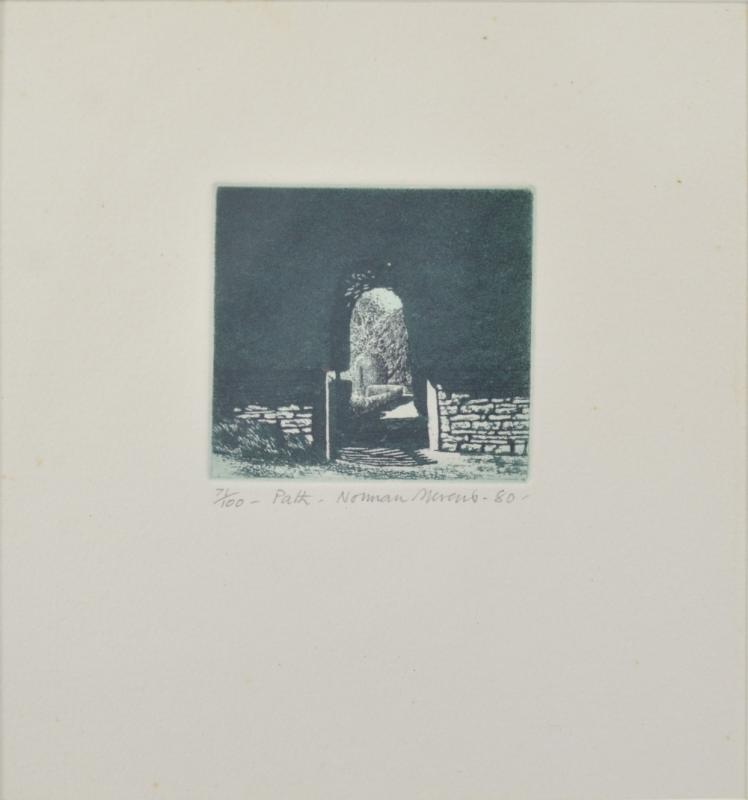Lot 604 of 668: NORMAN STEVENS, ARA (1937-1988); a coloured etching 'Path', no.71/100, signed and dated '80, 7 x 7cm, framed and glazed. (D)