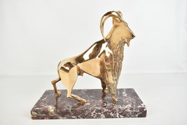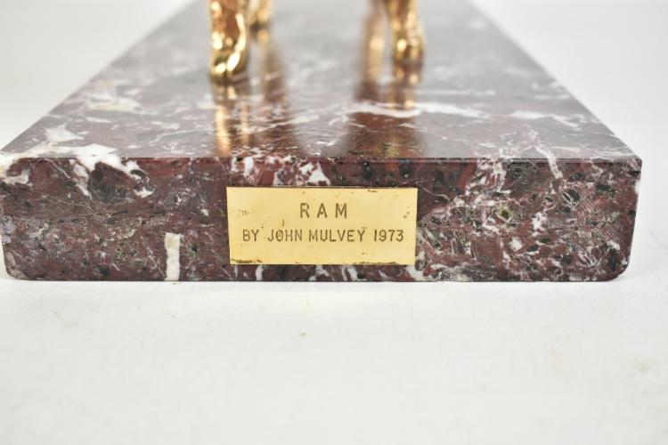 Lot 12 of 1148: JOHN MULVEY (born 1939); a polished bronze sculpture, 'Ram', signed with initials, dated 1973, no. 2/5, further detailed on a plaque to the rouge marble base, length of base 35.5cm, height 33cm. (D)