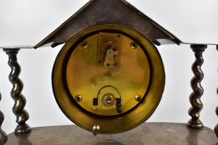 Lot 21 of 1148: ALBERT EDWARD JONES (BRITISH, 1878-1954); an Arts & Crafts pewter mantel clock with planished decoration and barley twist columns, the enamel dial with Arabic and Roman numerals, impressed 1780 to base, height 16cm, length 24cm, complete with two keys.