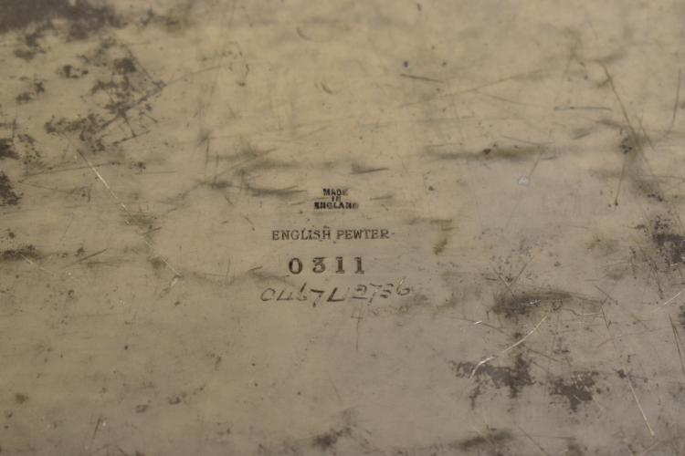 Lot 25 of 1148: ENGLISH PEWTER; an Arts & Crafts pewter twin handled tray with planished decoration to the centre within stylised embossed detail, length 36cm, impressed marks No.0311 to base.