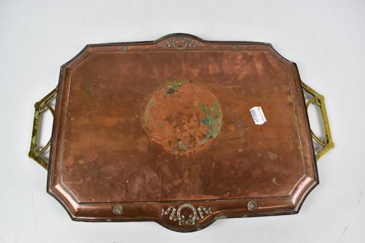 Lot 34 of 1148: KARL DEFFNER; an Art Nouveau rectangular copper tray with applied brass handles and embossed detail of bows and scrolls, impressed marks to handle, length 43cm.