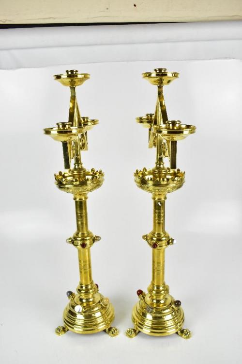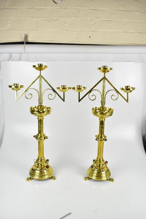 Lot 38 of 1148: A good and large pair of Arts & Crafts brass ecclesiastical candelabra with detachable three-light sconces above coloured glass cabochon set stem and base to paw feet, height 72cm (2).