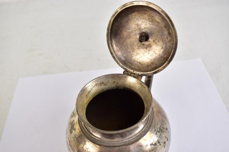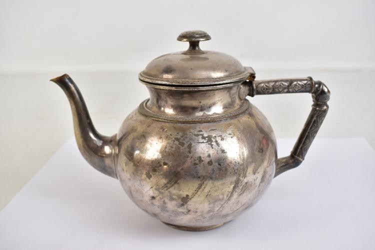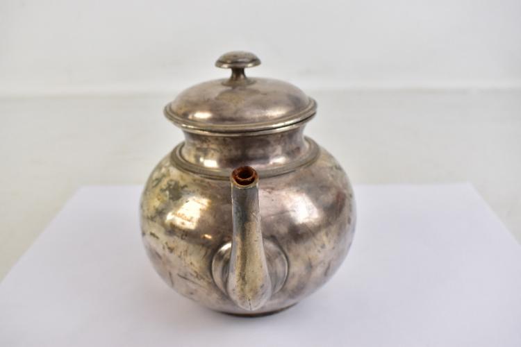 Lot 46 of 1148: IN THE MANNER OF DR CHRISTOPHER DRESSER FOR ELKINGTON & CO; a silver plated globular teapot, stamped marks to base, length 26cm.