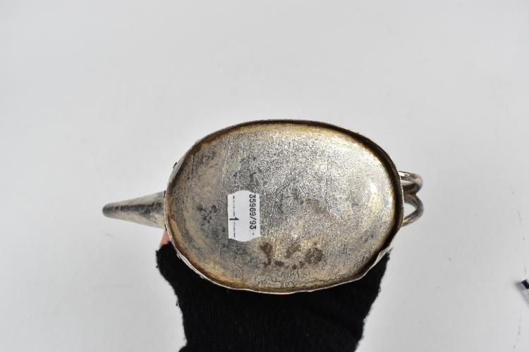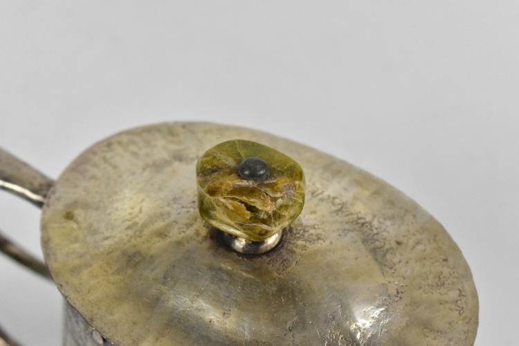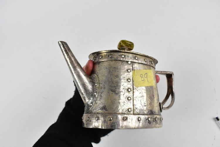 Lot 49 of 1148: An Arts & Crafts silver-plated Brutalist teapot, with hard stone finial and studdded decoration, unmarked, height 13.5cm (af).