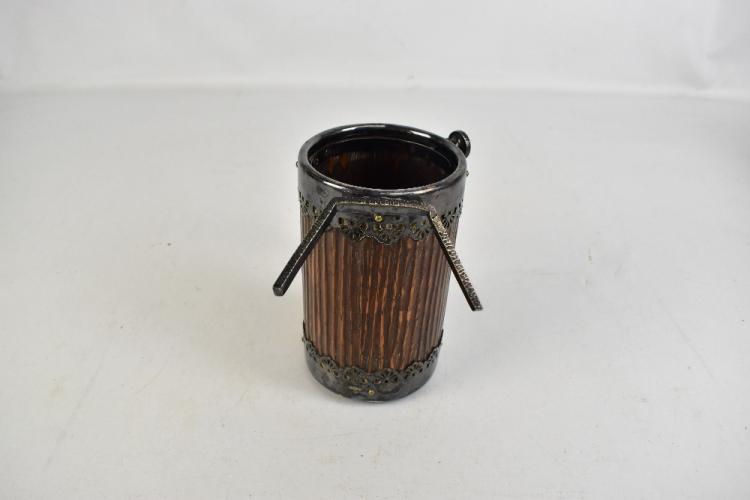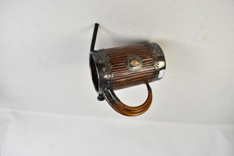 Lot 50 of 1148: HUKIN & HEATH LTD; a horn bottle stand with electroplated mounts, after the design by Dr Christopher Dresser, with stand, manufacturer's marks, reg. no.10737 and no.3350 to lower section, length 16cm (af).