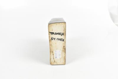 Lot 255 of 1148: TROIKA POTTERY; an early St Ives slab vase decorated in the Stoveman pattern to the front and a stylised face to the reverse, with manganese glaze, signed Troika St Ives to base, height 16.5cm.