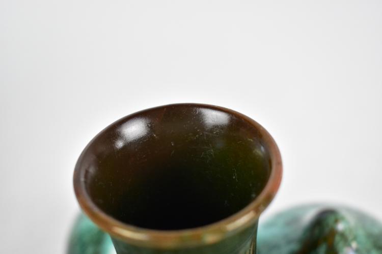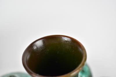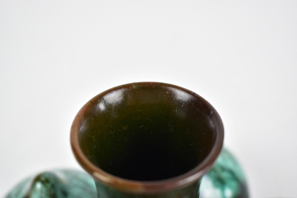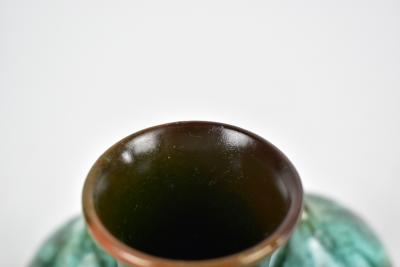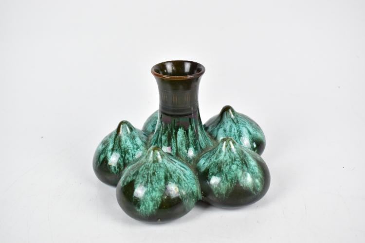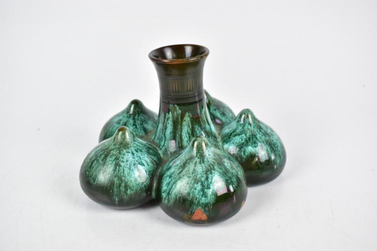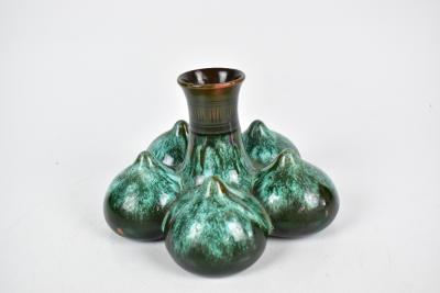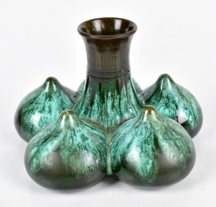 Lot 256 of 1148: CHRISTOPHER DRESSER (1834-1904) FOR LINTHORPE; an unusual art pottery vase of squat form with central neck flanked by five bulbous roundels with nipple style tops, with an all over green and blue glaze, impressed marks, signature and numbered 330 to base, height 10cm, diameter 16cm.