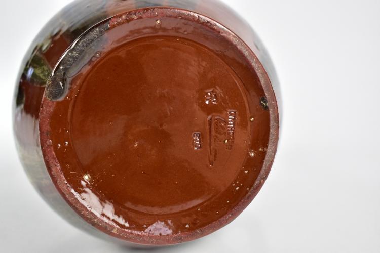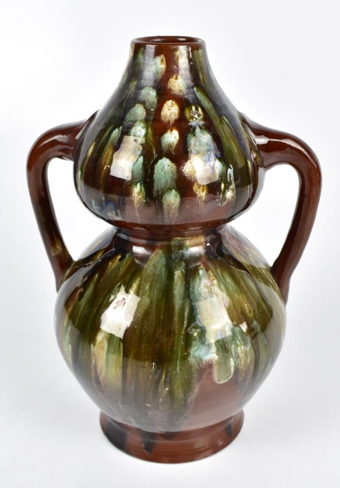 Lot 257 of 1148: CHRISTOPHER DRESSER (1834-1904) FOR LINTHORPE; an art pottery twin handled double gourd vase with green and brown dripped decoration on a brown glazed body, impressed marks and signature, numbered 872 to base, height 28.5cm.