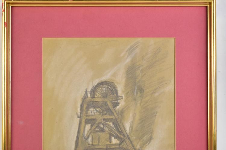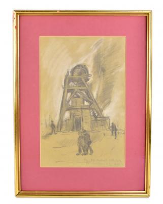 Lot 423 of 1148: HAROLD RILEY DL, DLitt, FRCS, DFA, ATC (Born 1934); pencil heightened with white chalk on light brown paper, mine shaft with figures, signed and dated 1964 and inscribed 'To Mrs Westwall with love for Christmas 1964, Harold Riley', 36.8 x 24.1cm, framed and glazed. (D) Provenance: Private Collection London. The Mrs Westwall Collection.