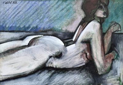 Lot 516 of 1148: GEOFFREY KEY (Born 1941); mixed media, reclining female nude, signed and dated 83, 14.25 x 20cm, framed and glazed. (D)