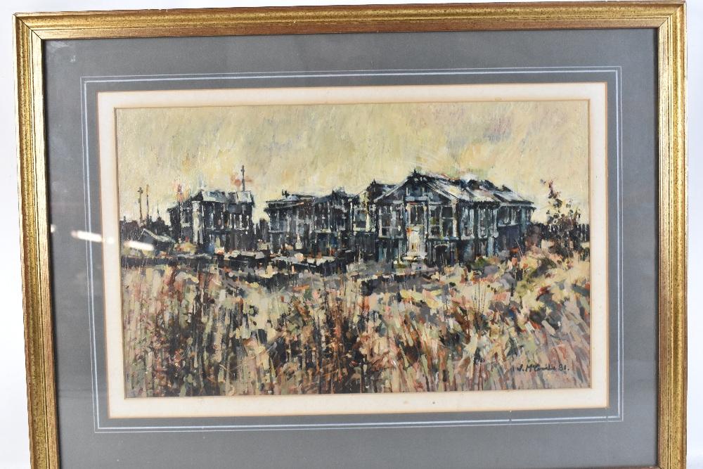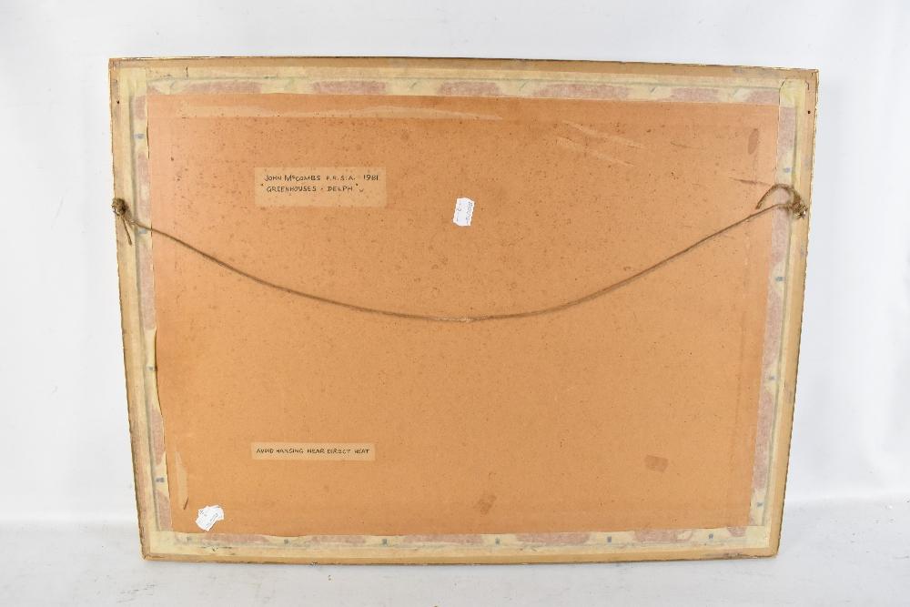 Lot 517 of 1148: JOHN MCCOMBS FRSA (Born 1943); oil on board, 'Greenhouses, Delph', signed and dated '81, 29 x 47cm, and a watercolour by Maureen Davie, 'Little Higher Bosustow', cottage ruins in rural landscape, signed lower right, 31 x 49cm, both framed and glazed. (D)