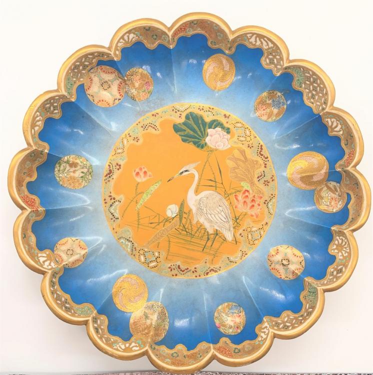 Lot 3 of 1030: TAIZAN YOHEI; a good Japanese Meiji period Satsuma dish with scallop moulded border and central circular panel decorated with a crane, signed, diameter 25cm.