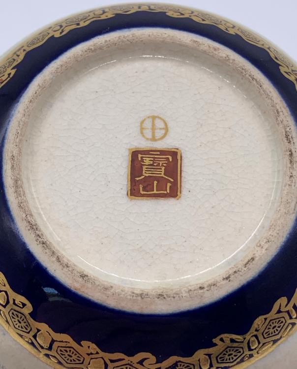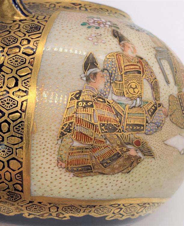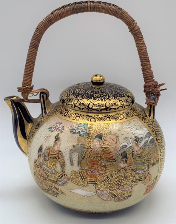 Lot 4 of 1030: HOZAN; a good Japanese Meiji period Satsuma miniature teapot with rattan handle and figural decorated body, signed with painted gold seal and gold mon to base, height when handle flat, 7.5cm, length 8.5cm.