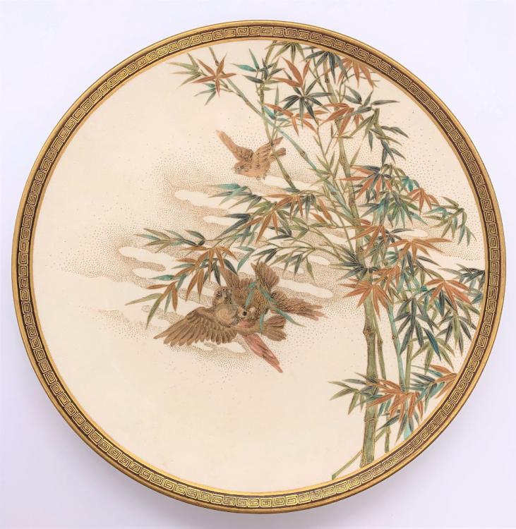Lot 6 of 1030: RYOZAN FOR THE YASUDA COMPANY; a fine Japanese Meiji period Satsuma plate decorated with birds amongst bamboo with a Greek Key border, with gold painted seal and mon, diameter 22cm.
