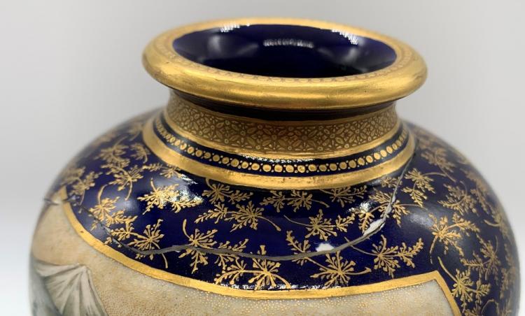 Lot 7 of 1030: KEIZAN FOR KINKOZAN; a Japanese Meiji period Satsuma vase decorated with twin landscape panels within a cobalt blue border, impressed seal and painted marks to base, height 15cm (badly af).