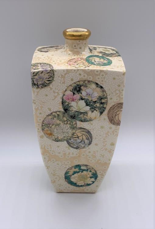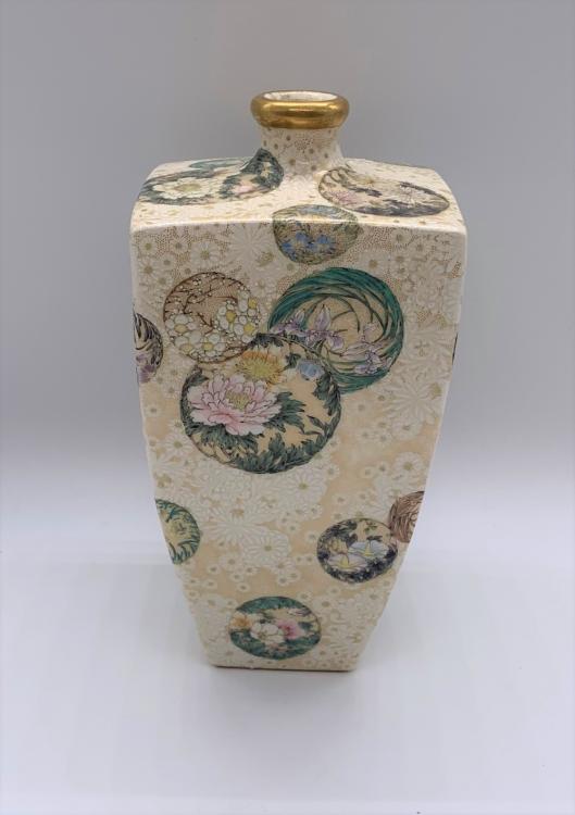 Lot 8 of 1030: ATTRIBUTED TO KINKOZAN; a Japanese Meiji period Satsuma square sectioned vase decorated with floral roundels on a floral cream ground, unsigned, height 15.75cm.