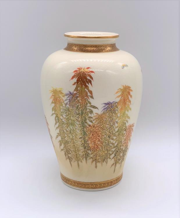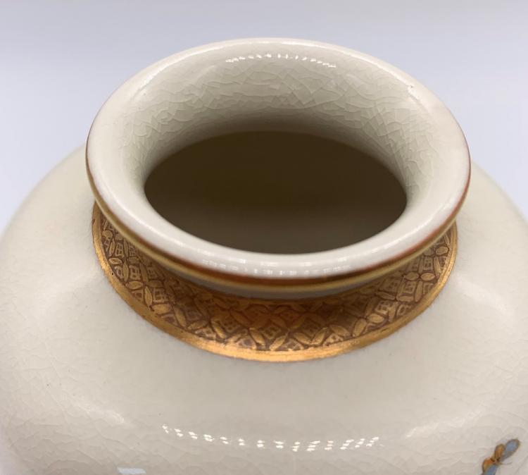 Lot 9 of 1030: KINKOZAN; a Japanese Meiji period Satsuma vase of ovoid form decorated with butterflies above leafy branches, signed with painted gold seal, height 12cm.