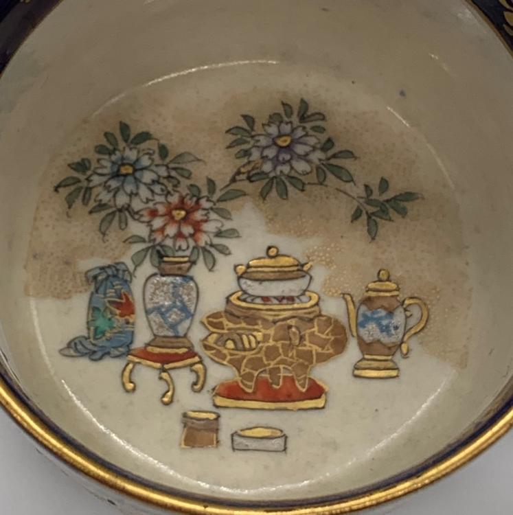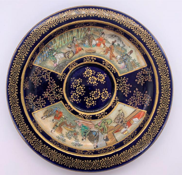 Lot 16 of 1030: KINKOZAN; a Japanese Meiji period Satsuma cup and saucer decorated with panels of seated figures within a cobalt blue ground, saucer with impressed seal, cup unmarked, diameter of saucer 12.8cm, height of cup 5.75cm.
