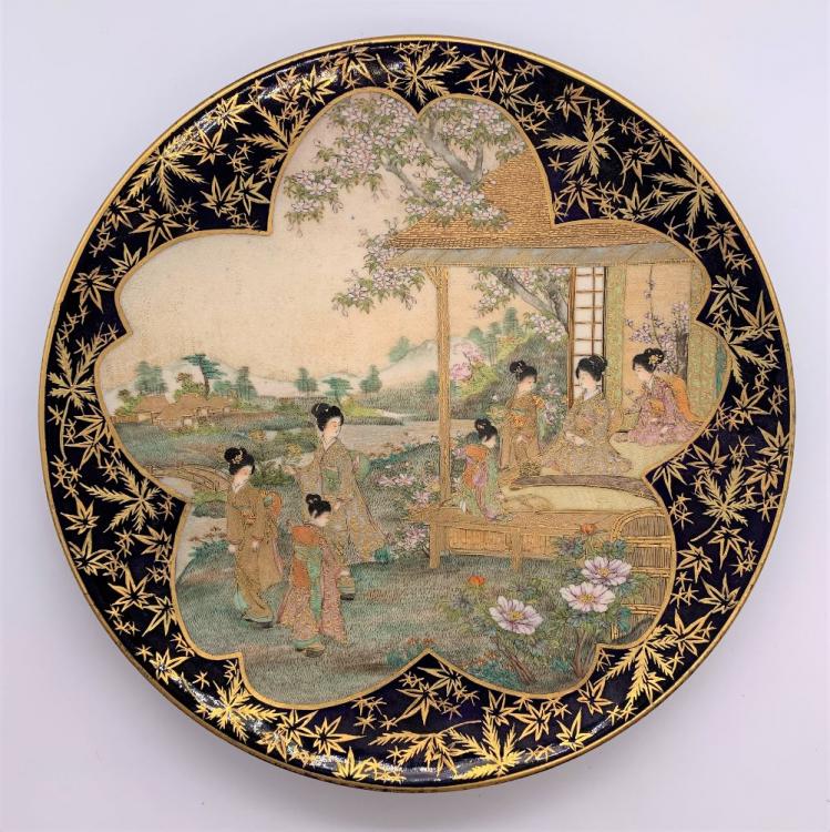 Lot 19 of 1030: A Japanese Meiji period Satsuma plate with cobalt blue border and central panel of figures with landscape beyond, diameter 21.25cm.