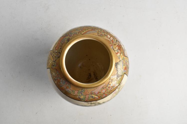 Lot 36 of 1030: A Japanese Satsuma vase of globular form painted with geishas inside floral panels, signed to base, height 23cm.